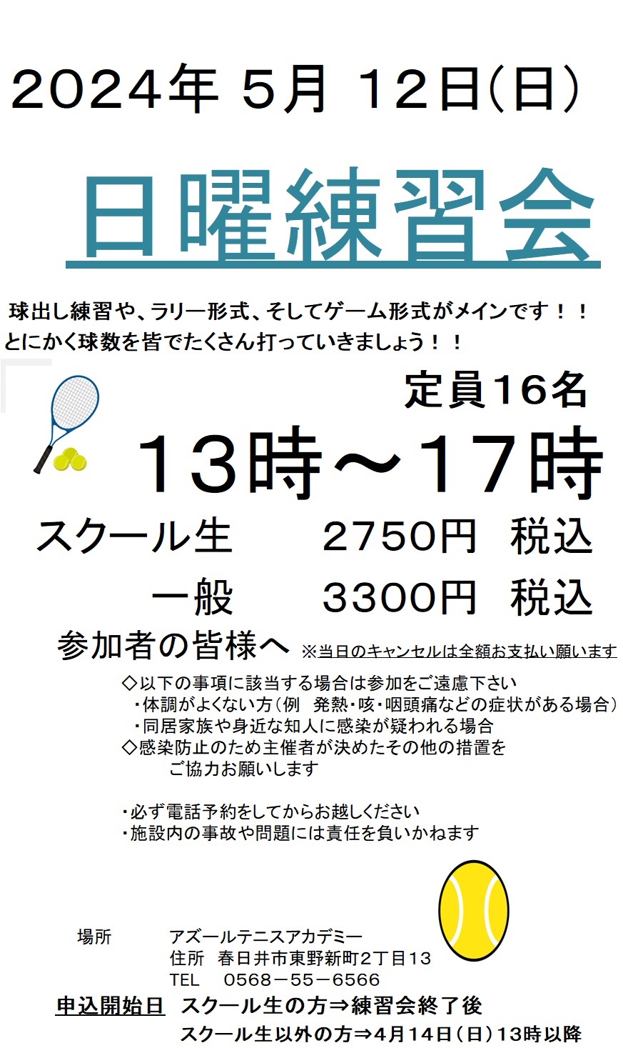 4月14日(日)13時以降よりスクール生以外の方も申込みいただけます。